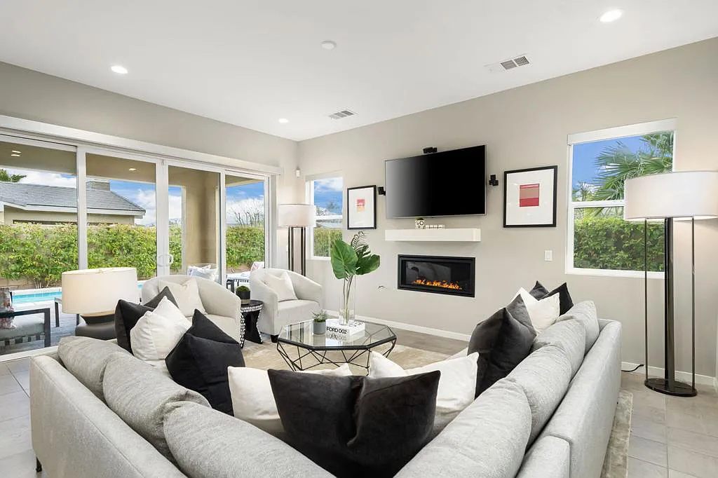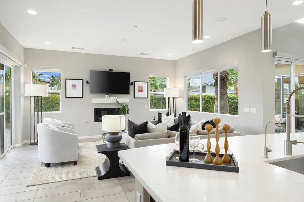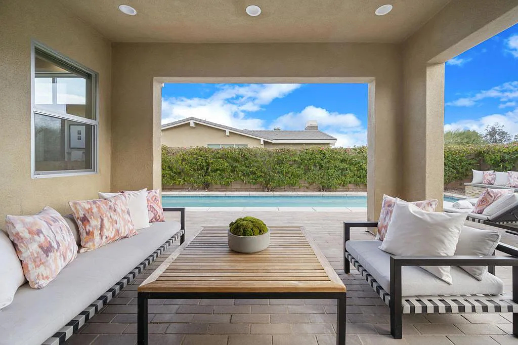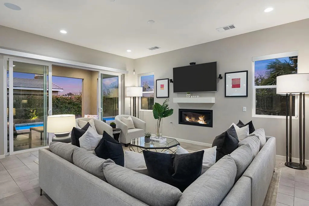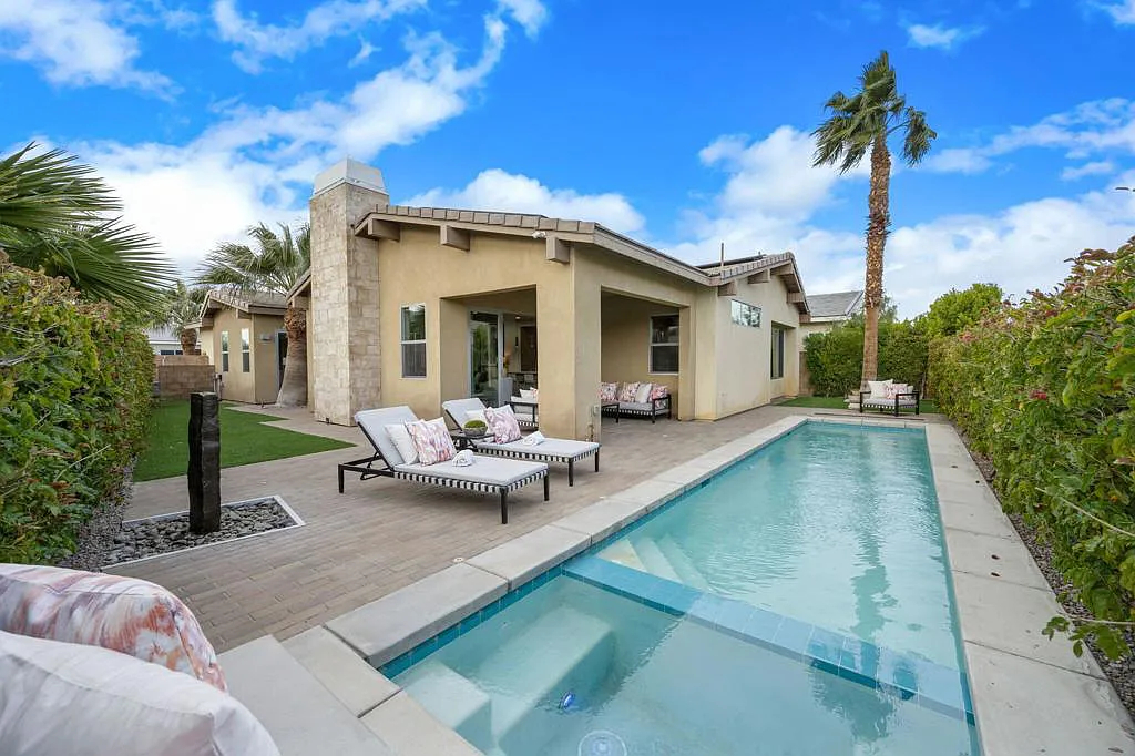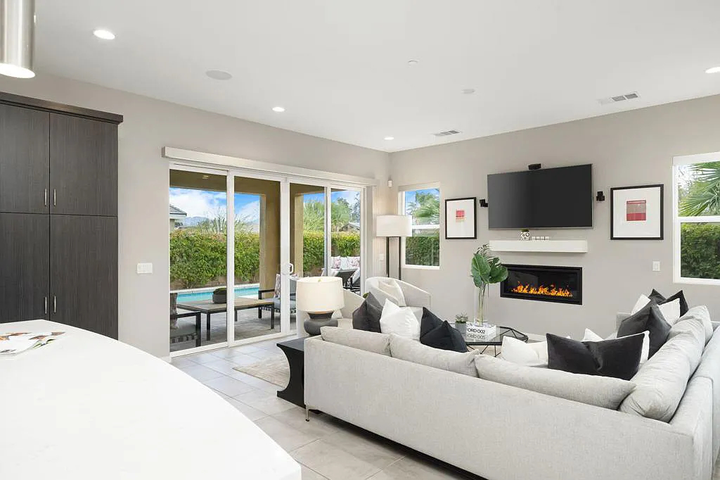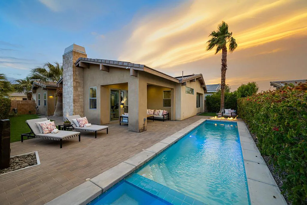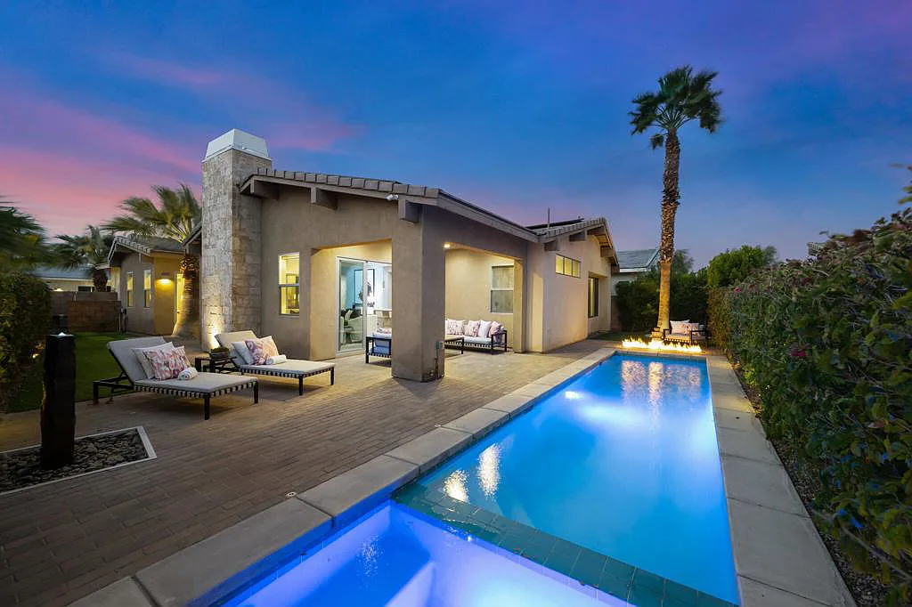 This highly upgraded mid-century inspired 2018 home is situated on a corner lot with a south facing backyard and has commanding southern and western mountain views! This rare 4 bedroom, 4 bathroom home shows like a model and feels brand new! With postcard perfect mountain views as the backdrop, this light-filled, gorgeous home has a private and secluded resort backyard with multiple outdoor entertaining areas, a covered patio, a pool and spa, multiple stone column fountains, two gas fire pits, landscape lighting, and built-ins. Both the living room and dining room have direct access to outdoor patio areas, which makes it the quintessential entertainer’s home with indoor/outdoor flow! The epicurean kitchen has a large center island, stainless steel appliances and an abundance of storage space. The primary suite is separated from the other suites for privacy and includes an expansive walk-in closet and beautiful spa bathroom with dual vanities, an oversized shower with a tiled bench and two shower heads. Some of the upgrades include a 20-panel solar system, a water softener system, solid hardwood doors and floors in bedrooms, custom day and night shades, heated/cooled garage with epoxy floors, 360 degree external camera system, security system, and so much more! This home is located in Escena, which was rated as one of the best public golf courses in California.