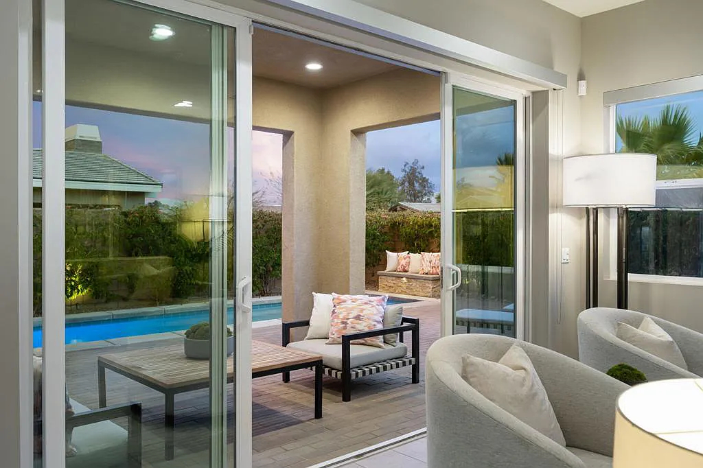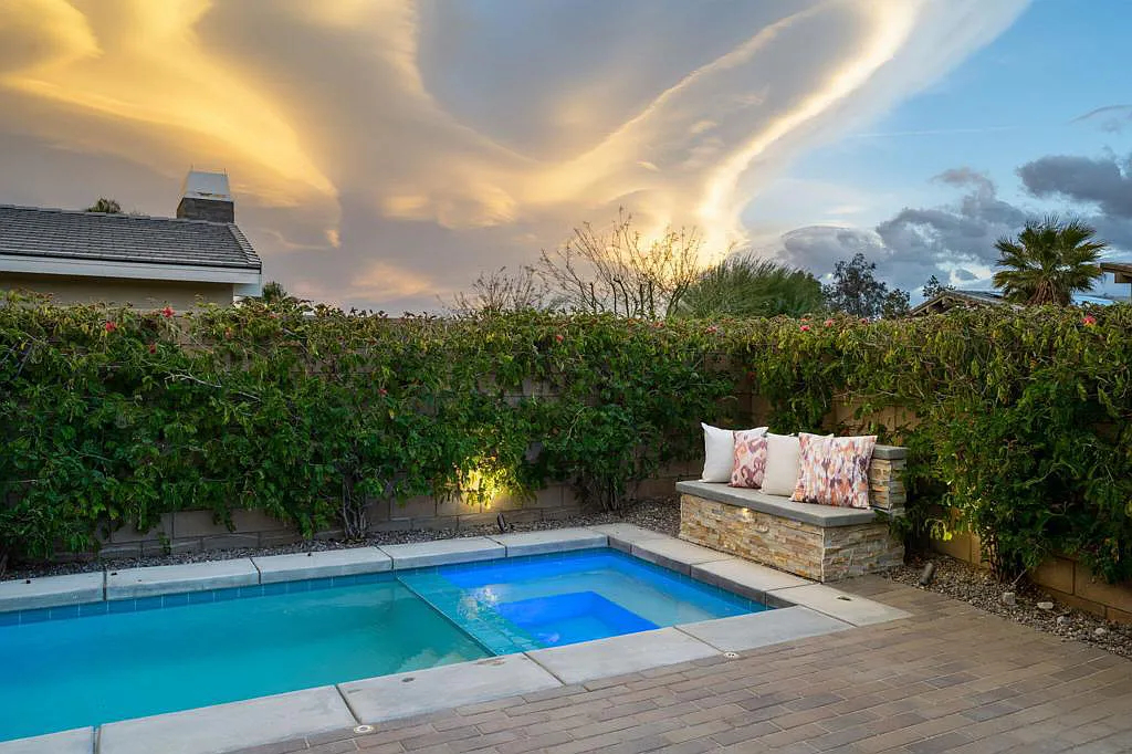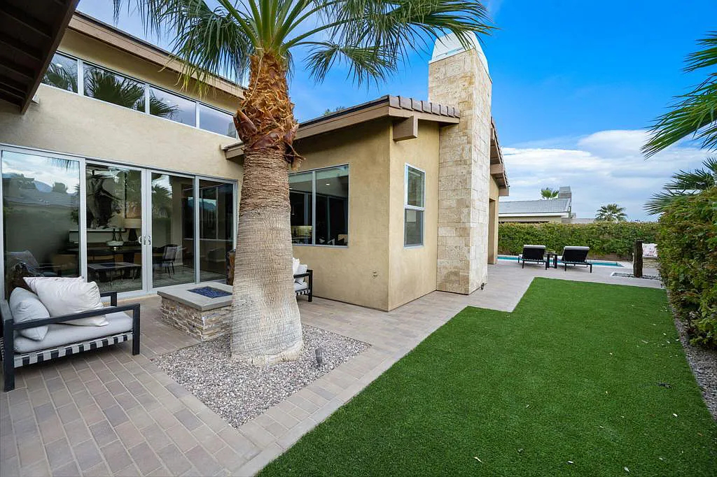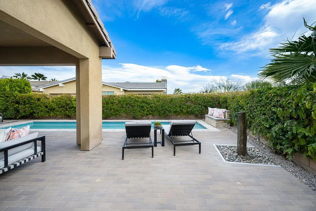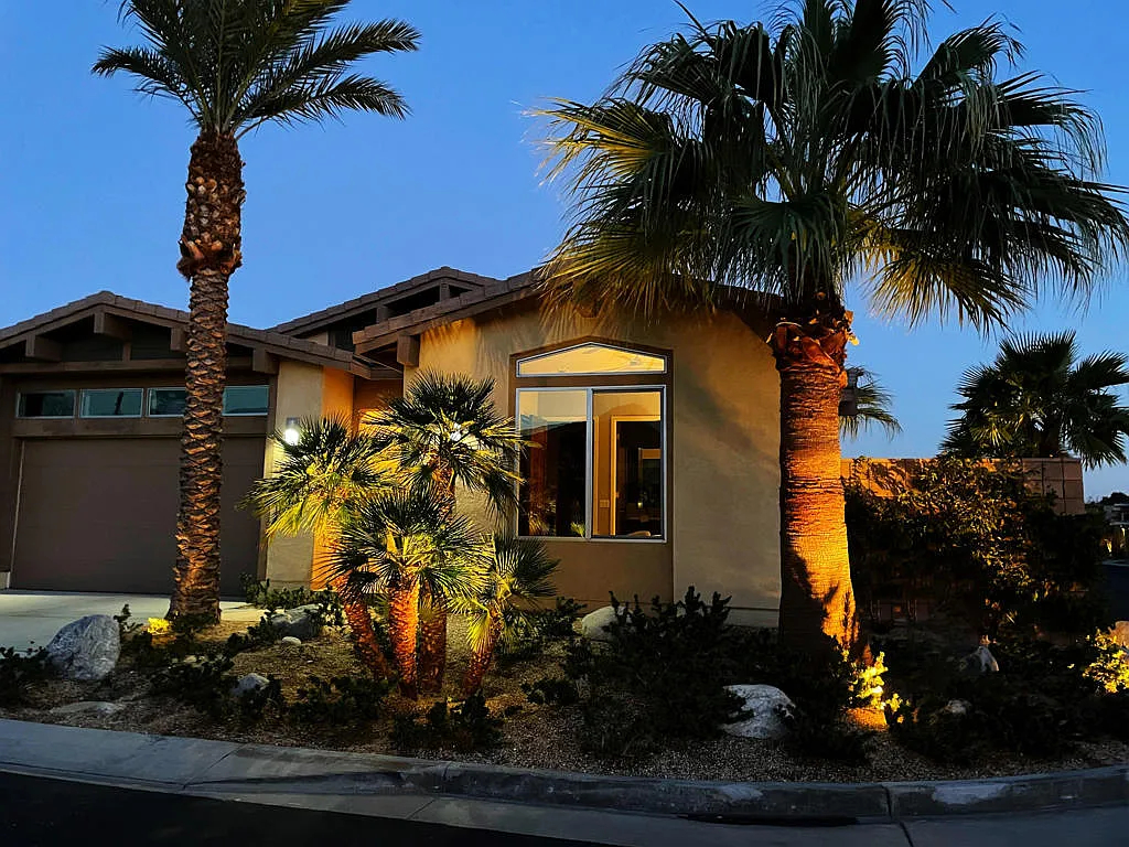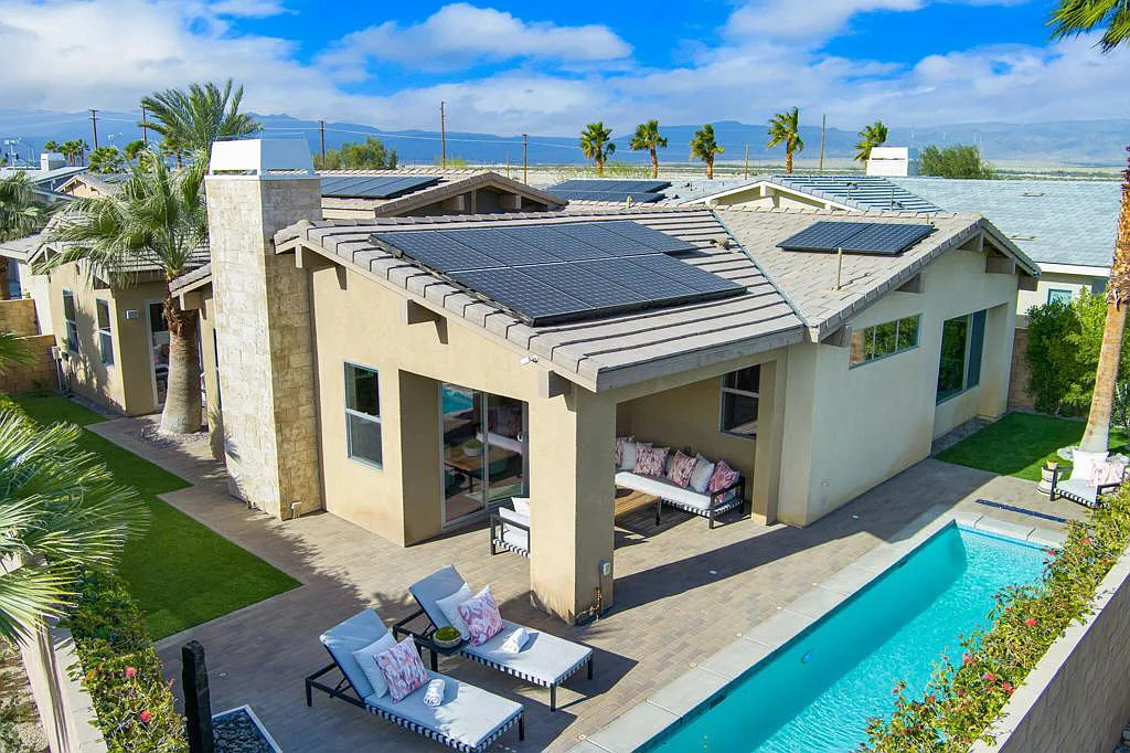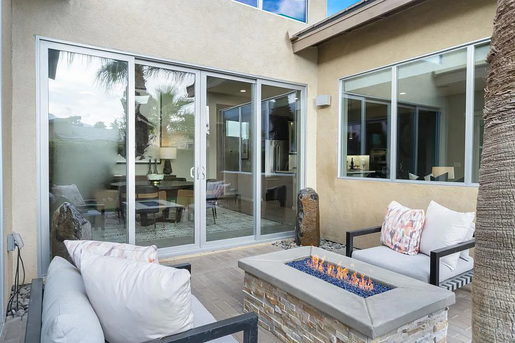 This highly upgraded mid-century inspired 2018 home is situated on a corner lot with a south facing backyard and has commanding southern and western mountain views! This rare 4 bedroom, 4 bathroom home shows like a model and feels brand new! With postcard perfect mountain views as the backdrop, this light-filled, gorgeous home has a private and secluded resort backyard with multiple outdoor entertaining areas, a covered patio, a pool and spa, multiple stone column fountains, two gas fire pits, landscape lighting, and built-ins. Both the living room and dining room have direct access to outdoor patio areas, which makes it the quintessential entertainer’s home with indoor/outdoor flow! The epicurean kitchen has a large center island, stainless steel appliances and an abundance of storage space. The primary suite is separated from the other suites for privacy and includes an expansive walk-in closet and beautiful spa bathroom with dual vanities, an oversized shower with a tiled bench and two shower heads. Some of the upgrades include a 20-panel solar system, a water softener system, solid hardwood doors and floors in bedrooms, custom day and night shades, heated/cooled garage with epoxy floors, 360 degree external camera system, security system, and so much more! This home is located in Escena, which was rated as one of the best public golf courses in California.