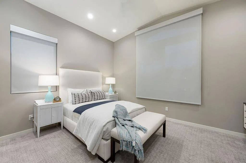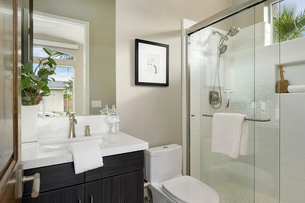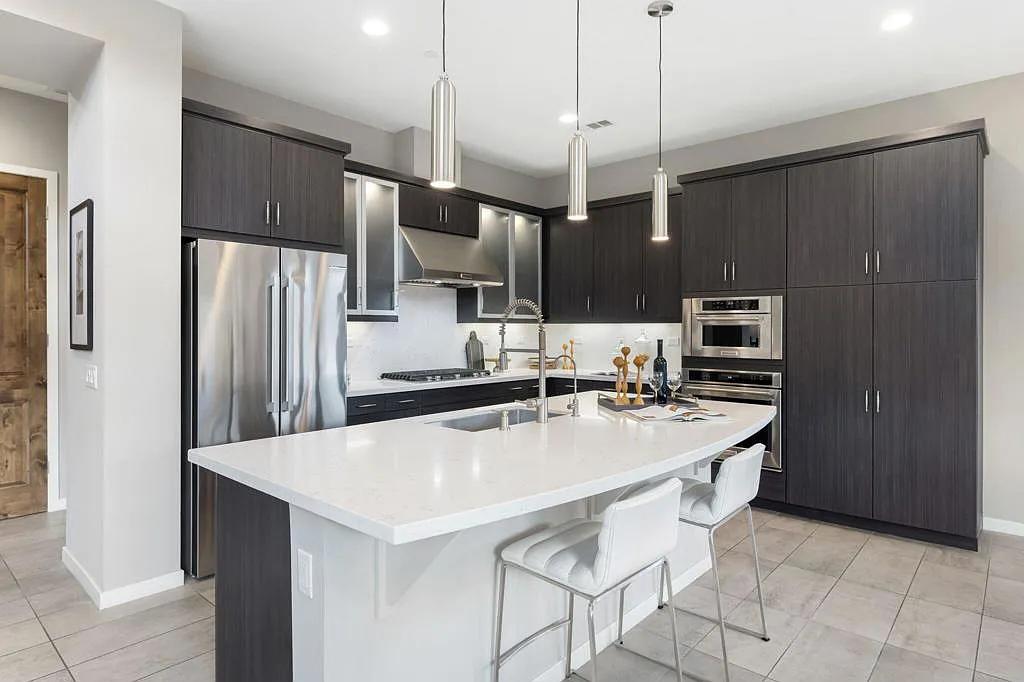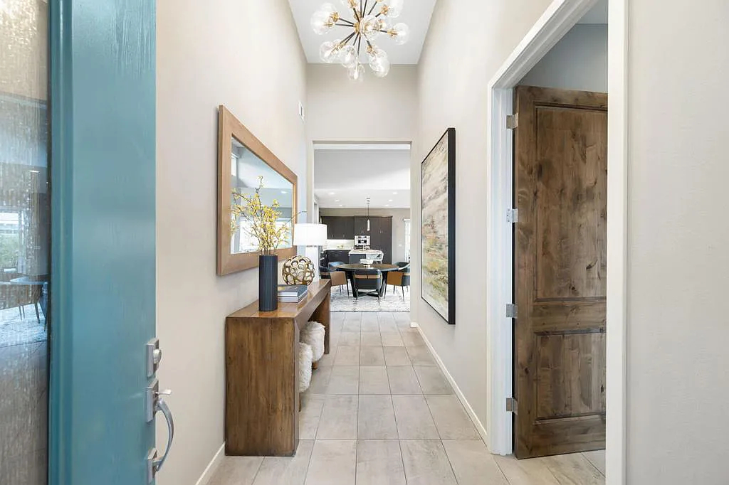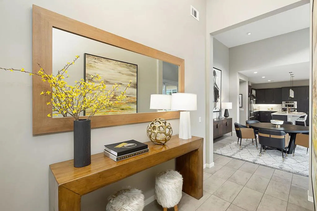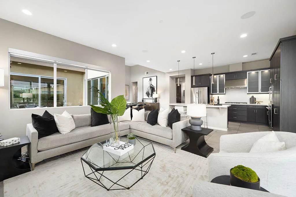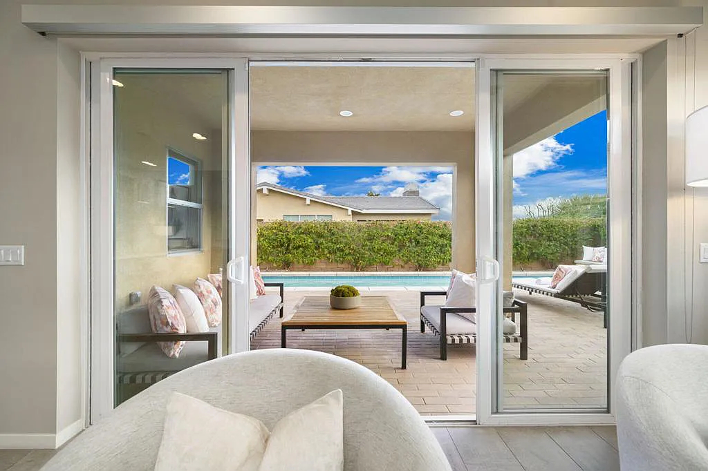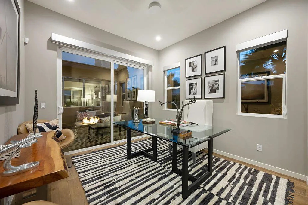 This highly upgraded mid-century inspired 2018 home is situated on a corner lot with a south facing backyard and has commanding southern and western mountain views! This rare 4 bedroom, 4 bathroom home shows like a model and feels brand new! With postcard perfect mountain views as the backdrop, this light-filled, gorgeous home has a private and secluded resort backyard with multiple outdoor entertaining areas, a covered patio, a pool and spa, multiple stone column fountains, two gas fire pits, landscape lighting, and built-ins. Both the living room and dining room have direct access to outdoor patio areas, which makes it the quintessential entertainer’s home with indoor/outdoor flow! The epicurean kitchen has a large center island, stainless steel appliances and an abundance of storage space. The primary suite is separated from the other suites for privacy and includes an expansive walk-in closet and beautiful spa bathroom with dual vanities, an oversized shower with a tiled bench and two shower heads. Some of the upgrades include a 20-panel solar system, a water softener system, solid hardwood doors and floors in bedrooms, custom day and night shades, heated/cooled garage with epoxy floors, 360 degree external camera system, security system, and so much more! This home is located in Escena, which was rated as one of the best public golf courses in California.